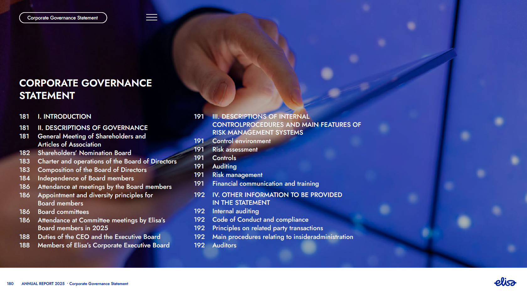 Elisa Corporation observes the recommendations of the Finnish Corporate Governance Code, which entered into force on 1 January 2020. We comply with law and our Code of Conduct in all our operations, and also expect it form our partners and suppliers.